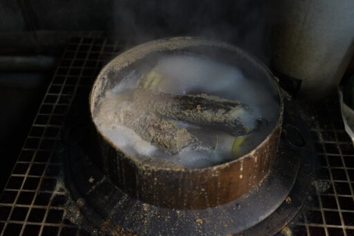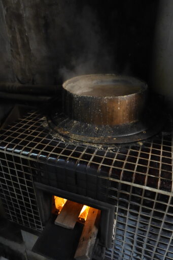 「かまど」で糠と一緒に強火で1時間炊いて、さらに火を落として蒸らします。